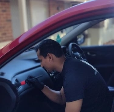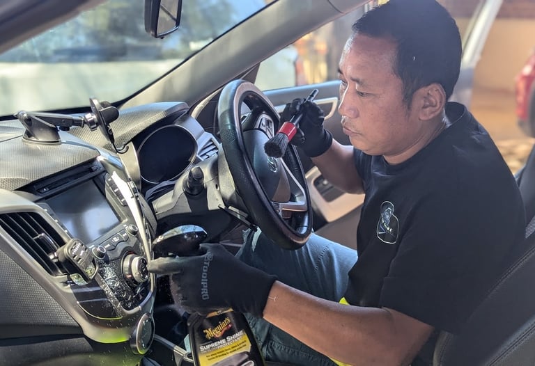 For fabric interiors, we use high-quality shampoos and steam cleaning to remove deep-seated stains, spills, and dirt from carpets and cloth upholstery. This service not only restores the appearance of your seats and floors but also eliminates odors and bacteria, making your interior feel brand new.